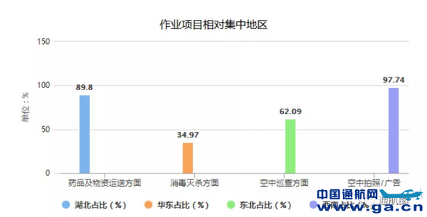 ![]() 2.作业项目相对集中。在药品及物资运送方面,目的地 为湖北地区的作业量占比高达 89.8%;在消毒灭杀方面,华 东地区占比 34.97%,中南地区占比 20.03%;在空中巡查方 面,东北地区作业量占比 62.09%,西南地区作业量占比26.86%;在空中拍照、空中广告方面,西南地区的作业量高 达 97.74%。