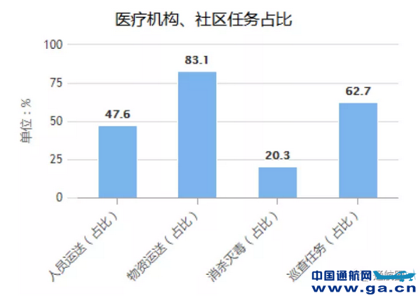 ![]() 4.作业更接近最终目的地。从各项任务降落机场(或临 时起降场地)看,47.6%的人员、83.1%的物资运送任务、20.3% 的消毒灭杀任务以及 62.7%的空中巡查任务发生在医疗机构、社区及其他工作和生活场所。