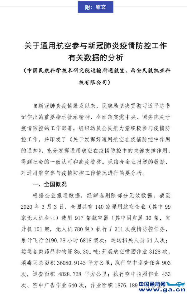 3月4日,民航局通用航空管理系统发布了《关于通用航空参与新冠肺炎疫情防控工作有关数据的分析》,数据充分证明了通用航空在执行小批量、多批次、 高频率、“点到点”的人员物资运输、消毒灭杀等空中作业 方面具有不可替代的重要作用,通用航空是紧急状态下的最佳作业力量之一。分析指出,在前一阶段疫情防控中通航企业执行的任务相对集中在疫情最严重的湖北地区,并有作业地域、作业项目、作业力量相对集中,作业更接近最终目的地,无人机广泛参与等阶段性特点(无人机技术因其“小、快、灵”的特点更适用于执行超低空空中巡查和精准的消毒灭杀任务,从通航企业数量看,执行疫情防控任务的 140 家企业中,无人机企业 99 家,占比达到 70.71%。从航空器数量看,917 架航空器中无人机 780 架,占比高达85.06%)。