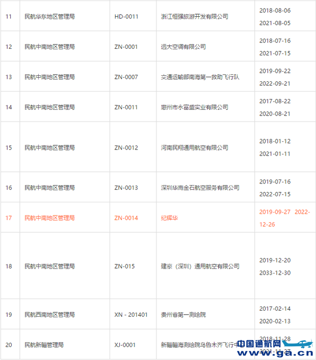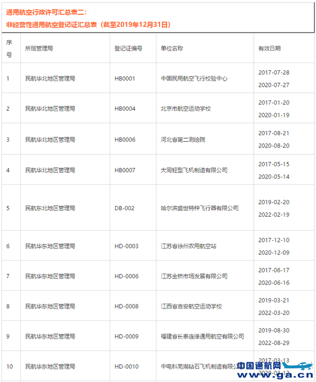 从民航局公布的《非经营性通用航空登记汇总表》中可以看到,截至2019年12月31日,全国共有20家非经营性通航企业&个人获得经营许可,其中19家为通航企业,1家为个人,具体登记汇总情况如下: