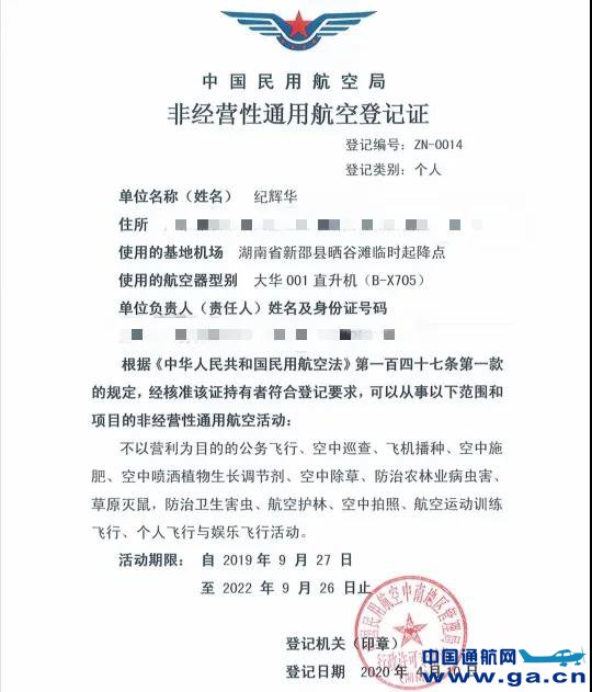 ![]() ![]() ![]() 个人登记的非经营性通用航空登记证,登记类别:个人