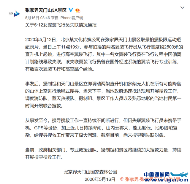 5月16日,张家界天门山国家森林公园通过微博发布了《关于5·12女翼装飞行员失联情况通报》,引发全社会关注。