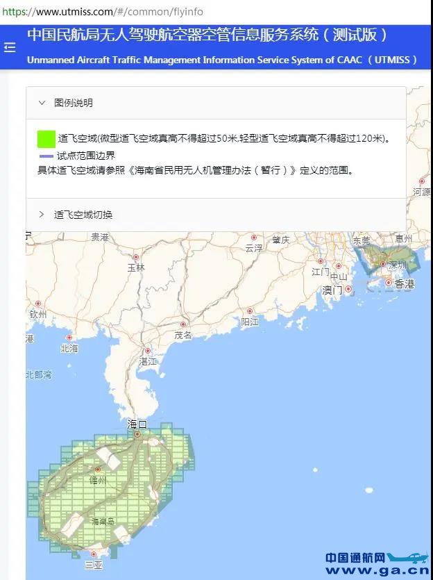 从上图可以看出,海南和深圳的试点区域都已经明确标出了适飞空域(绿框覆盖区域)。