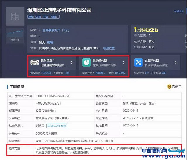图片来源:启信宝 启信宝数据显示,6月15日,深圳比亚迪电子科技有限公司(以下简称深圳比亚迪电子科技)正式成立,注册资本为5000万元,法定代表人为刘晓亮,经营范围包括无线电数据传输系统、智能消费设备、民用小型非载人无人机、航拍摄影设备及配件、手持式摄影设备、VR眼镜及其显示器和充电器的生产、研发和销售等业务,所属仪器仪表制造业。