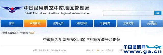 近期,中南局为湖南翔龙飞机有限公司的XL100飞机颁发了型号合格证TC0045A-ZN。