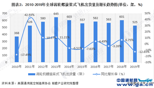 2010-2013年,涡轮机螺旋桨式飞机的出货量整体呈上升趋势;2014-2019年全球涡轮机螺旋桨式飞机的出货量呈下降态势,近几年全球对涡轮机螺旋桨式飞机的需求疲软。2019年,全球涡轮机螺旋桨式飞机的出货量为525架,同比下降12.64%。