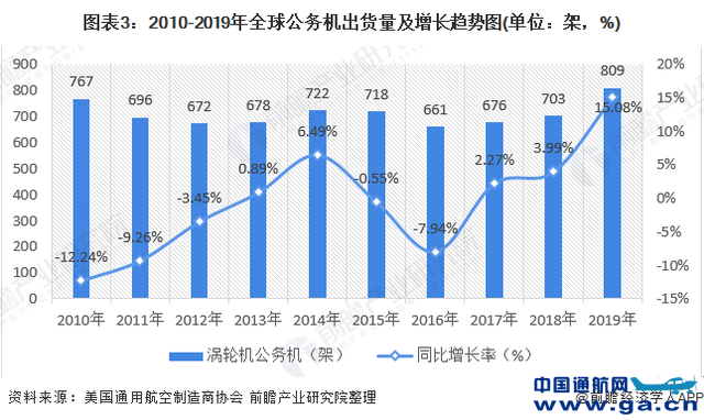 ![]() 近三年全球公务机出货量呈波动上涨态势,2019年共出货809架,同比增长15.08%