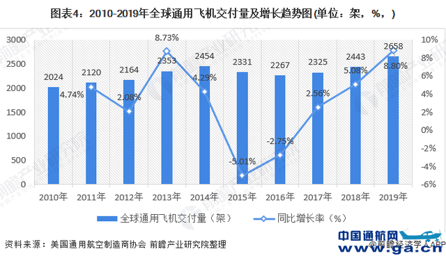 2010-2018年,全球通用飞机交付量均保持在2500架以下,每年的同比增长率均保持在正负五个百分点以内,可见这9年全球通用飞机交付量的增长较为平稳,有些年份还会出现下降的情况。2019年全球通用飞机的共交付2658架,同2018年的2443架相比,增长了8.80%,全球通用飞机的成交量达到了最近10年来的顶峰。