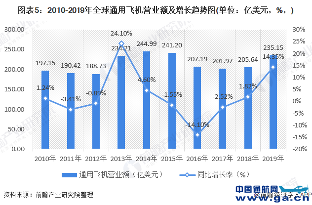 ![]() 全球通用飞机营业额较为波动,2019年营业额235.15亿美元,同比增长14.35%