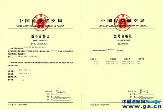 2019年12月19日,DS-100、DS-115两型自转旋翼机已获得局方颁发的型号合格证(TC)(戳此了解详情)。据了解,洛阳罗德普蓝拥有多项专利技术和自主知识产权,是目前河南洛阳唯一具有型号合格证(TC)和生产许可证(PC)的旋翼机整机研发生产企业。
