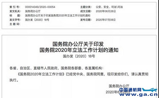 ![]() 一年过去了,《无人驾驶航空器飞行管理暂行条例》终于正式纳入国务院2020年立法工作计划。对下一步工作,国务院办公厅的通知要求,国务院各部门要深刻认识做好立法工作对于坚持和完善中国特色社会主义制度、推进国家治理体系和治理能力现代化的重大意义,高度重视立法工作计划的贯彻执行。要加强组织领导、完善工作机制、压紧压实责任、加强沟通协调,集中精力高质高效按时完成重点立法项目。