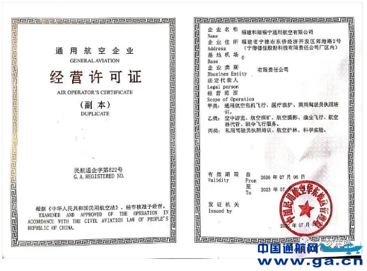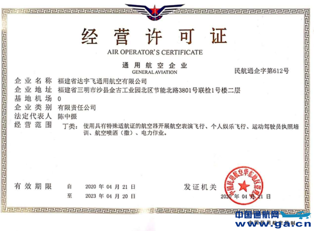 在此之前,即2020年4月,福建省达宇飞通用航空有限公司也获得了民航局颁发的经营许可证,运行机型为C42飞机。