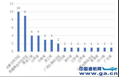 新疆、内蒙两自治区短途运输航线数量最多,占全国总量的36.5%。内蒙古自治区和新疆维吾尔自治区是我国最早开展短途运输试点的地区,目前两自治区航线数量最多,分别为10条和9条,两自治区短途运输航线总数占全国总量的36.5%。