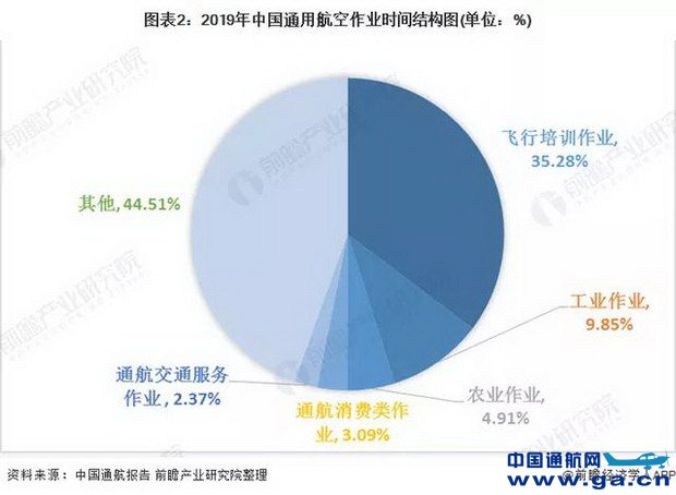 ![]() 2019年,我国的通用航空飞行市场主要集中在飞行培训、工业和农业,这三类市场占总额的50%,主要呈现出飞行培训比重偏高、农业作业服务及工业作业服务市场单一、私人消费比重偏低三种市场需求结构特点。
