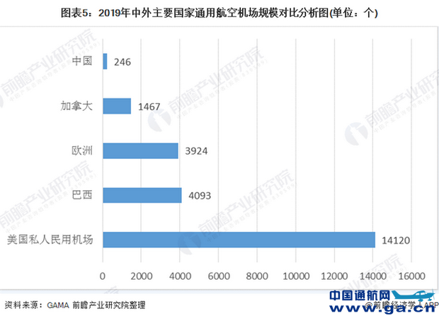 ![]() 截至2019年底,中国颁证通用航空机场数量为246个;美国拥有19750个机场,其中私人民用机场数量达到14120个,包括直升机场5425个,水上机场290个,普通机场8405个等;欧洲有通用机场3924个。可见我国通用航空机场规模较其他通用航空发达国家仍有较大差距。