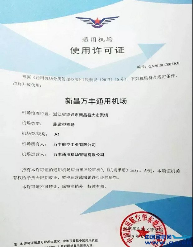 ![]() 2018年8月27日浙江万丰通用机场正式获得民航华东局颁发的A1类通用机场使用许可证,万丰集团着力打造的通航全产业链又向前迈出了实质性的一步。