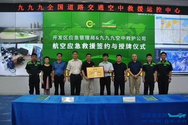 7月24日上午,烟台开发区应急管理局同九九九空中救护有限公司举办首支“航空救援队”签约授牌仪式,正式将其纳入全区应急救援体系,并授予其“开发区航空应急救援队”称号。九九九空中救护有限公司承诺协助烟台开发区应急管理局开展公共安全事件、抗灾减灾救灾、城市消防、空中巡查、航空运输、物资投送、道路交通事故等方面工作,并承诺每年提供2次以上的大型应急救援演练无偿支持服务。
