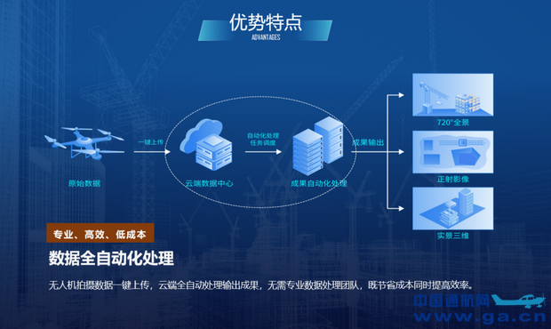 无人机采集完数据后一键上传云端,云端自动处理成果,无需专业内业团队。轻松获取专业的正射影像、720°全景、实景三维。