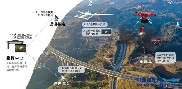 其中,50公斤级垂直起降飞行器-大白鲨V50担当了“空中天眼“的侦察职能,配备双光云台相机搭载640P红外热像仪,达到30倍光学变焦与4倍数码变焦,智能监控地面状态,仅用10秒即精准探测、定位火点并将实时画面回传至指挥中心。其采用复合翼布局,无需跑道,起降灵活,且具备6小时超长航时、最长图传距离100+公里,具备平飞七级抗风、全天候飞行能力、4500米高海拔起飞等卓越性能。