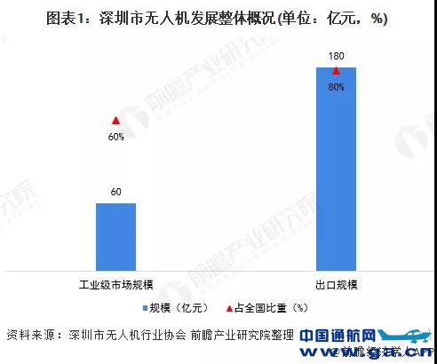 深圳是我国较早从事无人机产品生产和技术研发的城市,发展至今已成为全球无人机最重要的生产基地。目前,深圳市无人机产值超过400亿元,初步测算2019年达到500亿元。深圳工业级无人机占国内60%的市场份额;全年无人机出口180亿元,占据全国八成左右的份额,以消费无人机、植保无人机、行业无人机、玩具无人机及配套产品为主。从全球范围来看,无人机的需求主要集中在欧美地区,以深圳企业为代表的消费级无人机生产企业,成为全球消费级无人机的主要提供商,输出产品达全球的70%,行业级无人机也占有较大份额。