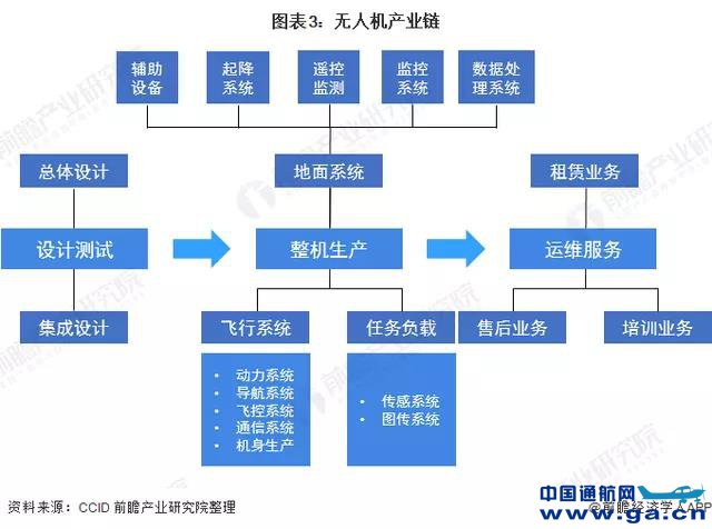 首先,先从无人机产业链布局方面来看。无人机产业链可分为上游设计测试、中游整机生产以及下游运维服务三个主要环节,每个环节各有细分侧重点。