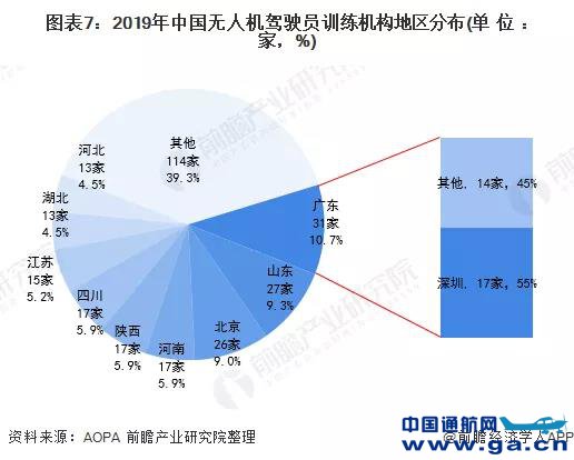 无人机产业链下游主要是运维服务,包括租赁业务、售后服务、培训业务等。目前,在无人机下游衍生产业中,深圳布局也较为完善。截至2019年底,全国经中国AOPA审定合格取得过培训资质的在营无人机驾驶员训练机构共290家。从地区分布来看,广东省以31家排名第一。而在广东省中,深圳又以17家,55%的占比排名全省第一。