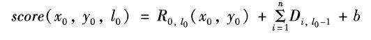 ![]() 其中,score(x0,y0,l0)表示l0尺度空间中锚点为(x0,y0)窗口的分数,R0,l0(x0,y0)为l0中根模型相似度得分,为l0中多个可变部件模型得分和,b为偏差值。