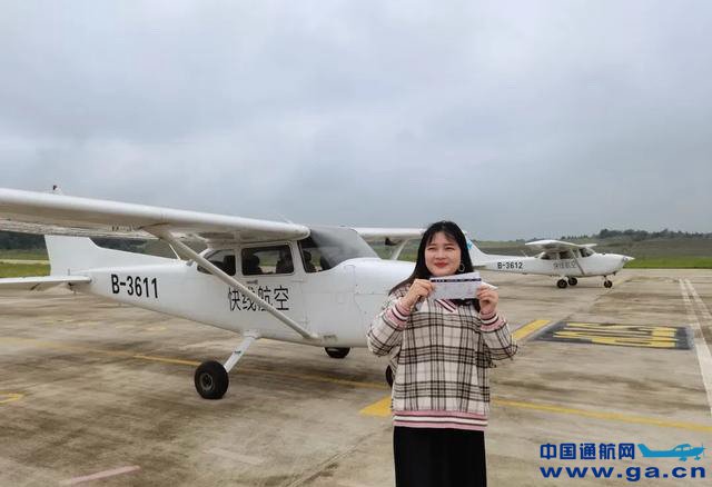 ![]() △ 旅行爱好者胡萍在塞斯纳飞机前展示“株洲-常德”首航机票