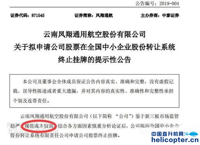 ![]() 2019年2月21日,凤翔通航在新三板终止挂牌,理由是“规范成本较高”。