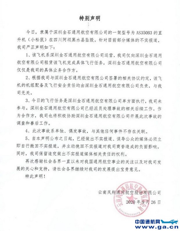 云南凤翔通航公司9月26日对外发布消息:今日,隶属于深圳金石通用航空有限公司的一架型号为AS350B3的直升机(小松鼠)在四川阿坝黑水县坠毁。针对目前部分媒体的不实报道,我司严正声明如下: ![]() ![]() ![]() ![]() |