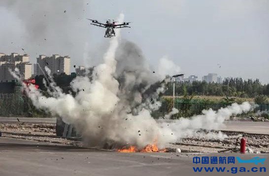 ![]() 在无人机反恐处突演练现场,两名“暴恐分子”作案后携带爆炸物品逃至模拟废弃房屋内,与追捕民警对峙,民警无法正面突入,在四周戒备。指挥中心立即启动应急预案,指令无人机飞至废弃房屋上方对持枪歹徒喊话劝降,对“暴恐分子”进行心理压制。破窗无人机起飞,飞至废弃房屋前进行瞄准破窗,窗户瞬间被击破。M600无人机搭载武器投射系统紧随其后开始投放烟雾弹,“暴恐分子”在烟雾弹的薰呛下冲出废弃房屋,四周戒备的民警迅速将其制服。但“暴恐分子”遗留爆炸物依旧在废弃房屋内,具有极大安全隐患。“接警”后,特警成立排爆组迅速奔赴现场,身着排爆服将爆炸物小心移出废弃房屋,将爆炸物悬挂在M600无人机投放系统上,无人机平稳起飞,将爆炸物运离并快速投放至排爆罐内。