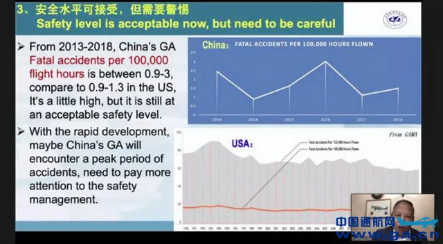![]() 接下来,高教授用国际通行的通用航空安全评价指标—每10万小时致命事故率,通过与美国通用航空安全水平记录进行对比,对中国通用航空安全情况进行了评判和解析。2013-2018年,中国通用航空每10万飞行小时致命事故率介于0.9-3之间,而美国则是0.9-1.3,约高于美国,但就中国通用航空目前的发展阶段而言仍是在可接受的安全水平,但随着中国通用航空的快速发展,越来越多的新来者(new comer)将进入这一领域,中国通用航空将可能面临一个事故高发期,通用航空安全问题需要高度关注。