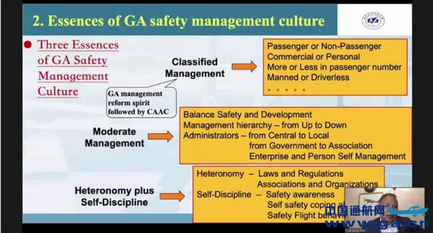 ![]() 高教授从通用航空飞行活动的分级分类管理、平衡安全与发展的关系,通用航空飞行员群体的他律与自律三个层面剖析了通用航空安全管理。他表明,营造安全的通用航空环境、实现可接受的通用航空安全水平记录,需要相关管理部门、协会、通航企业各方共同努力,以及飞行员群体良好飞行行为的养成。