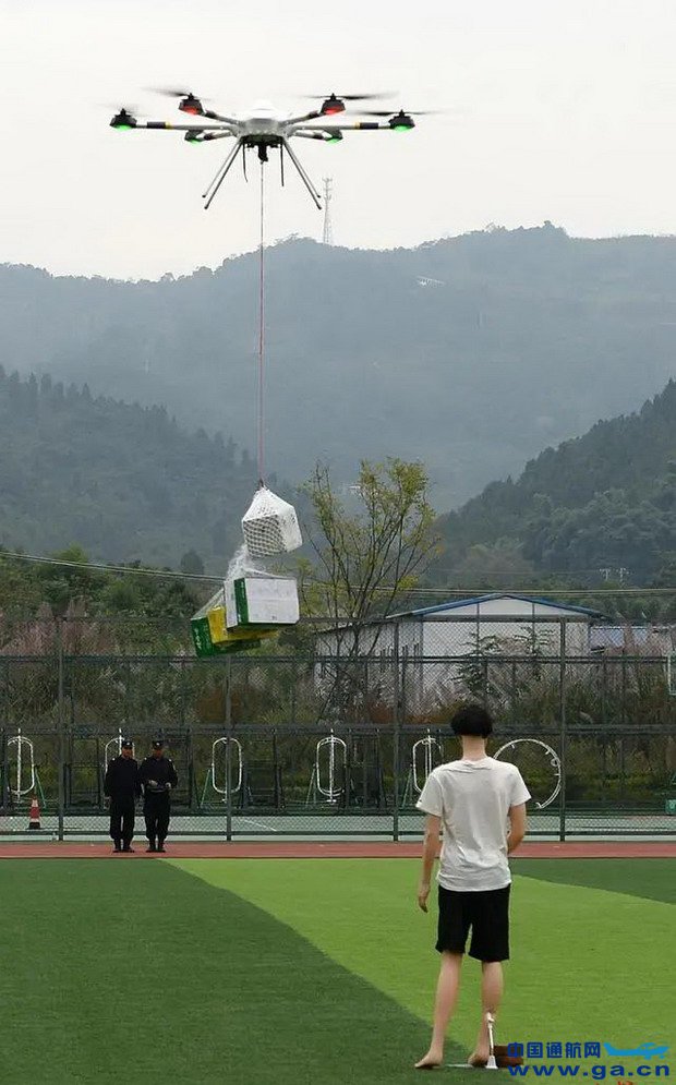 10月15日,天府新区通用航空职业学院运动场的演练现场。在两名飞手的操控下,一架无人机腾空而起,携带医药箱、矿泉水和食物,飞向了远处的“被困者”。它缓慢下降,向“被困者”靠近,来到一个合适的高度,将物资成功投放到指定位置。