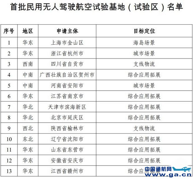 日前中国民航局公布了首批共13个民用无人驾驶航空试验基地(试验区)。