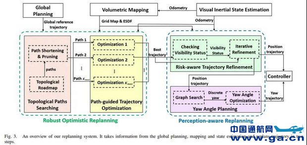 本文所提出的重规划系统如图 3 所示。该算法利用全局规划、密集映射和状态估计模块的输出,对全局参考轨迹进行局部修改,以避免先前未知的障碍物。