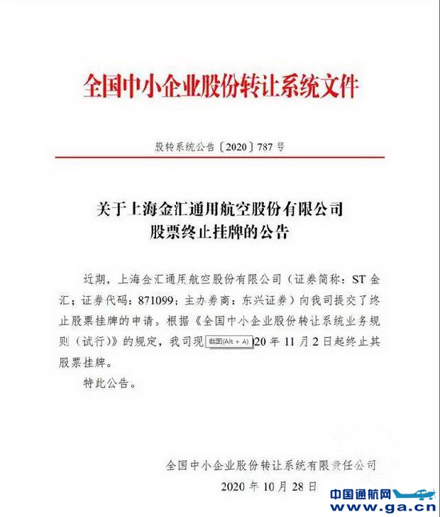 紧接着,金汇通航出现股票跌停迹象。10月28日,全国中小企业股份转让系统有限责任公司发布消息称,上海金汇通用航空股份有限公司已提交终止股票挂牌的申请。根据相关规定,决定自2020年11月2日起终止其股票挂牌。