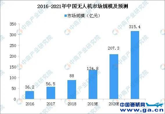 无人机是利用无线电遥控设备和自备的程序控制装置操纵的不载人飞机,目前,无人机广泛应用于航拍、农业、植保、微型自拍等领域。当前,我国无人机产业发展成绩显着,从技术研发、产品生产、企业布局到市场规模、领域应用和产业细分,都取得了长足发展。预计未来三年,随着民用无人机的耐久性和使用成本等问题得到根本性的解决,无人机在民用市场的应用将更具多样化。同时,需求的增长和管理措施的不断完善将促使无人机继续成为世界航空航天工业最具增长活力的市场之一。2018年中国无人机市场规模达到88.0亿元,同比增长55.8%。预计到2021年,无人机市场规模将超过300亿元。