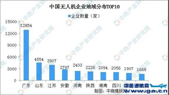 企查查数据显示,我国无人机相关企业数量最多的省份是广东省,共12854家;山东省排名第二,共4554家;江苏省排名第三,共3907家。