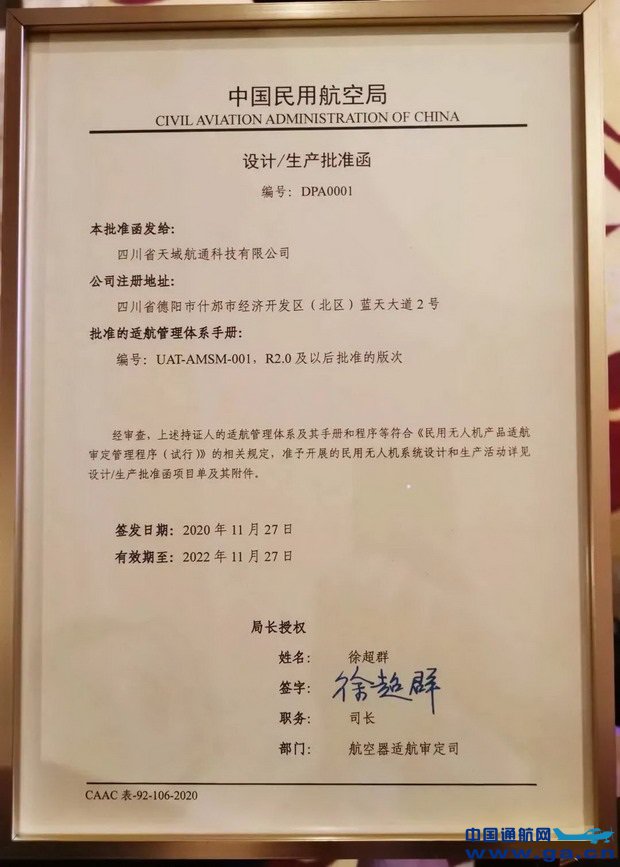 继京东“京鸿”货运无人机在自贡成功载货检飞后,昨日四川又传来了好消息:11月27日下午,民航局适航审定司司长徐超群在四川德阳向四川省天域航通科技有限公司正式颁发了鸿雁(HY100)大型无人机系统“设计生产批准函”(编号:DPA0001),标志着全国首个大型无人机“准生证”落户德阳什邡。这也是今年颁发的《民用无人机产品适航审定管理程序( 试行) 》实施以来国内无人机研发制造企业获得的第一个包含设计和生产资质的适航证件。鸿雁(HY100)大型无人机系统获颁“准生证”,意味着全国首个通过适航审定的大型无人机系统的诞生,具有里程碑意义。
