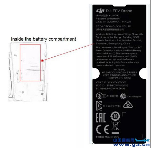 从标签上可以看到,该无人机的型号为FD1W4K,可能指向4K,并具有一个在22.2V下运行的2000mAh电池。该标签还位于电池仓内,表明在飞行过程中电池被锁定,以确保无人机坠落时更安全。