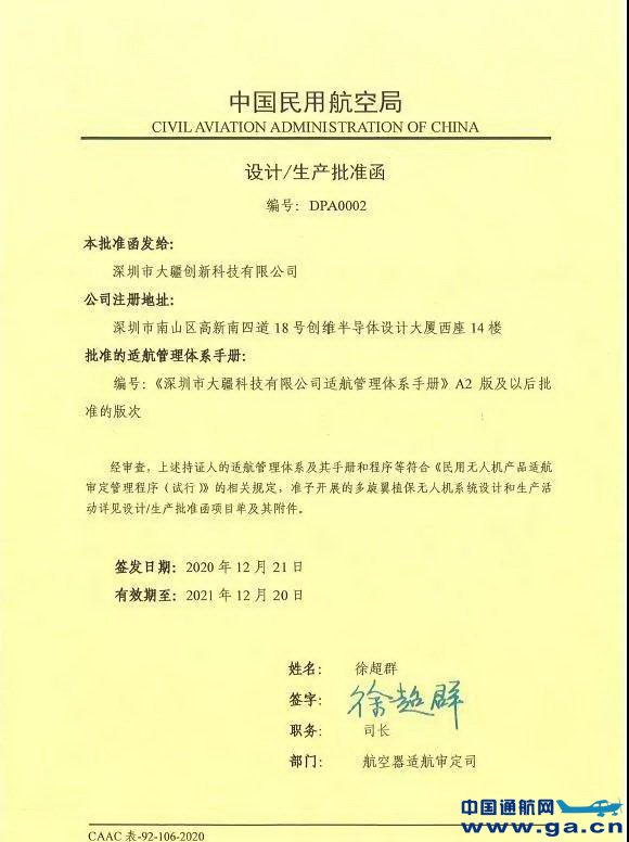 12月21日,民航局适航司司长徐超群在深圳市向大疆创新科技有限公司颁发了国内首个植保无人机系统设计生产批准函(编号:DPA0002),这是继11月27日在四川颁发出全国首个民用无人机系统设计生产批准函后(里程碑!民航局适航司颁出全国首张大型无人机“准生证”),民航局颁发出的一个细分类别无人机系统的设计生产批准函。