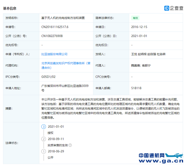 企查查App显示,比亚迪(002594)于2021年1月1日申请公开“基于无人机的充电控制方法和装置”专利信息,专利公开号CN108227690B,具体内容含本公开涉及交通工具领域,具体地,涉及一种基于无人机的充电控制方法和装置。 ![]() ![]() |