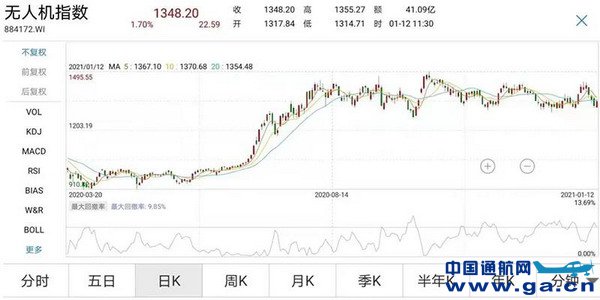 ![]() 与之相呼应的是,今日由Wind资讯编制的无人机指数及相关多只个股飘红。记者注意到,该指数在2020年10月14日创出1495.55点新高,并在高位运行持续至今。