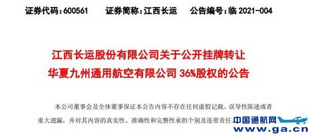 江西长运(SH 600561)昨日(2月8日)晚间发布公告称,拟将持有的华夏九州通用航空有限公司36%股权以7290.10万元为底价通过江西省产权交易所挂牌方式公开转让。也就是说,华夏九州通航的第一大股东江西长运拟将持有的股份全部转让。 ![]() 据介绍,华夏九州通用航空有限公司(简称“华夏九州通航”)位于江西省南昌市南昌高新区,于2016年8月注册成立,最初注册资金为4亿元人民币,由航空工业集团(AVIC)下属成员单位中航工业昌飞与民营企业江西凯文科技有限公司、民营企业江西军工思波通用航空服务有限公司三家共同出资组建,最初定位为中航工业昌飞专业性的民机销售代理商,规划投资规模为100亿元、占地近千亩,其中包括通航总部、通航运营基地和服务中心等项目。据当时的报道,公司除大力开拓民机整机销售业务外,还计划不断创新销售模式,提供飞行小时出售、飞机租赁、运营服务咨询、售后服务、托管等服务,努力发展成为国内直升机通航产业示范基地。