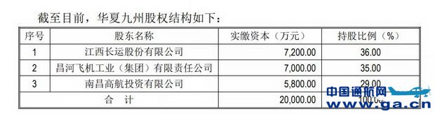 如今到了2021年,华夏九州通航的注册资金已由成立时的4亿元缩减为2亿元人民币。公司目前股权结构中,注册时的2个民营企业股东已全部退出,目前股东中,南昌市国资背景的上市公司江西长运持股36%,航空工业集团(AVIC)下属昌河飞机工业集团持股35%,南昌市高新区国资企业南昌高航投资有限公司持股29%。