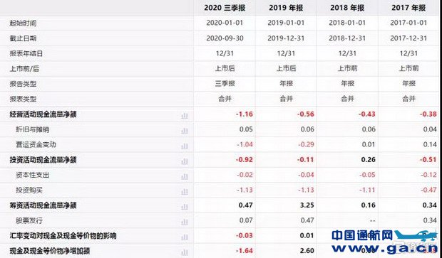 其另一个特征是,现金流依赖外部融资。在账面整体产生亏损的情况下,公司的经营活动现金持续流出,而且流出金额还远远大于净亏损额。2020年Q3亿航亏损4100万元,经营活动现金流出却是1.16亿元。