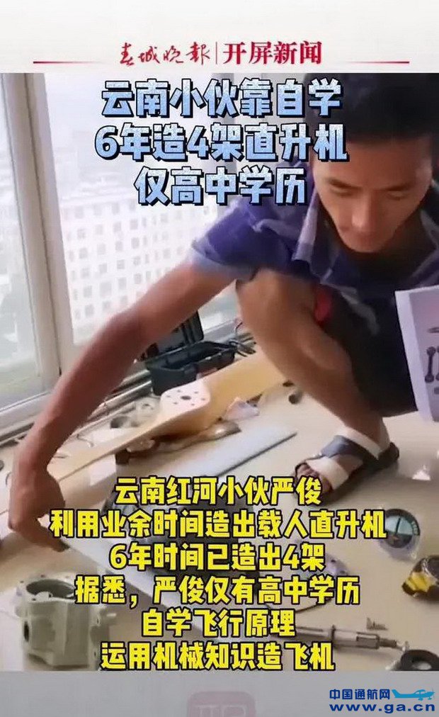 2月17日,云南红河,只有高中学历的小伙严俊利用业余时间造出载人直升机。自学飞行原理,运用机械知识,花费了6年造出了4架直升机,在之前此基础上不断的改进,现在制造的是第4代飞机。 ![]() 严俊介绍,他以前比较喜欢玩航模,后来兴趣慢慢转到载人直升机这一方面,通过一边自学一边设计制造,最后才成功的。不过,严俊之所以能比较顺利地造出直升机,是因为他有10多年机械方面的基础,比较容易上手。