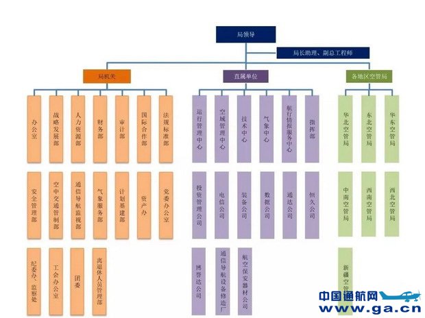 中国民用航空局空中交通管理局(简称民航局空管局)是民航局管理全国空中交通服务、民用航空通信、导航、监视、航空气象、航行情报的职能机构。中国民航空管系统现行行业管理体制为民航局空管局、地区空管局、空管分局(站)三级管理;运行组织形式基本是区域管制、进近管制、机场管制为主线的三级空中交通服务体系。