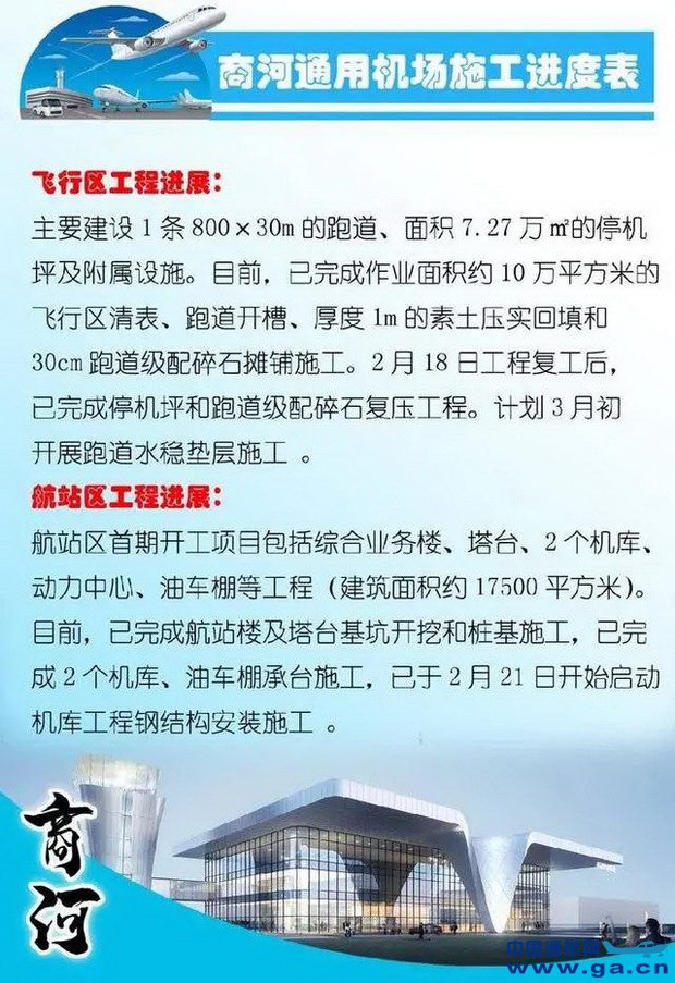 ![]() 2021年,商河继续加快推进通用机场项目建设,机场指挥部和各参建单位,坚持高标准、高质量,加班加点抢抓施工黄金期,全力以赴加快项目建设进度,预计年底机场将具备运营条件,圆商河人民一个飞天梦想。